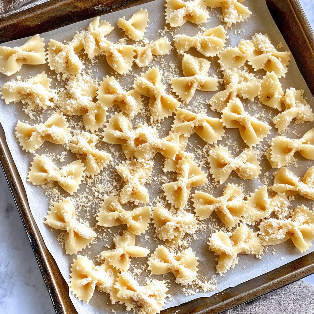 Preheat your oven to 400°F (200°C). Spread out your cooked pasta on a baking sheet lined with parchment paper. Make sure they’re in a single layer so they crisp up nicely.