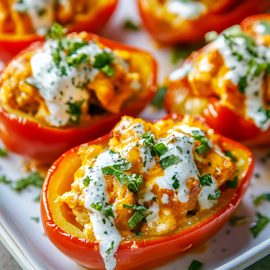 Buffalo chicken stuffed peppers are a deliciously spicy and nutritious dish that perfectly combines comfort food with healthy ingredients. Each vibrant bell pepper is generously filled with tender shredded chicken coated in zesty buffalo sauce, then topped with melted cheddar cheese for an irresistible finish.
