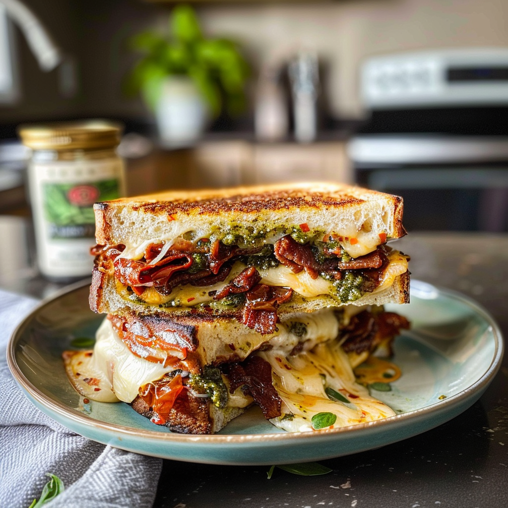 Experience a gourmet twist on a classic comfort food with this Sun-Dried Tomato Bacon Pesto Grilled Cheese. This sandwich combines the rich flavors of crispy bacon, tangy sun-dried tomatoes, and fresh pesto, layered between hearty bread and gooey cheese. Perfect for lunch, dinner, or a late-night snack, each bite delivers a delightful explosion of flavor that will have you coming back for more.